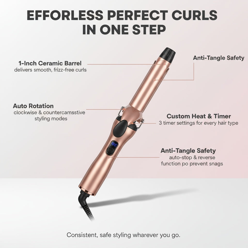 • 1-inch ceramic barrel for silky, frizz-free curls • Automatic bi-directional rotation for versatile direction • Four heat and three timer settings for all hair types • Anti-tangle, auto shut-off, dual voltage, LED display